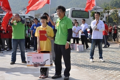 原來是江西高能投資集團(tuán)有限公司舉行2011員工登山活動(dòng)。一大早160余名參加活動(dòng)的員工分四路從南昌出發(fā),趕往獅子峰腳下集合。大約九點(diǎn),準(zhǔn)時(shí)到達(dá)比賽起跑點(diǎn)。參賽員工在各公司領(lǐng)隊(duì)的帶領(lǐng)下,按照事先抽取的跑道號(hào),秩序井然地排好隊(duì)列,各公司旗手站在首位,高舉隊(duì)旗,六種顏色的衣服組合在一起,和綠樹青山交相輝映,形成一道亮麗的風(fēng)景線。九點(diǎn)十分,比賽正式開始。大家無暇欣賞美麗的景色,一路你追我趕。約三十幾分鐘后,山上的工作人員聽到了有人即將登頂?shù)穆曇簦蠹夷弥鴶U(kuò)音器不停的吶喊助威。伴隨著加油聲,三個(gè)敏捷的身影向終點(diǎn)飛奔而來,幾乎同時(shí)到達(dá)終點(diǎn),其中一位居然是女性。閃光燈閃亮,記錄了這一勝利而又喜悅的時(shí)刻。他們是140號(hào)王小華、42號(hào)王世泰和25號(hào)許艱,成績(jī)分別為“32分17秒、32分20秒、32分32秒”。當(dāng)集團(tuán)公司和二、三級(jí)公司領(lǐng)導(dǎo)登上頂峰的時(shí)候,大家異常興奮。雖然身心疲憊,雖然汗流浹背,但是每個(gè)人臉上都洋溢著勝利的喜悅和光芒,因?yàn)樗麄兛朔酥刂乩щy,堅(jiān)持到了最后,特別是站到山頂上俯瞰著山下的一切,“會(huì)當(dāng)凌絕頂,一覽眾山小”,他們此時(shí)的心境應(yīng)該是無比的驕傲和自豪。