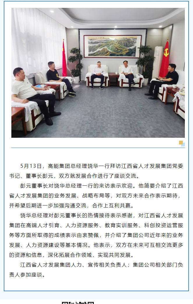 高能集團(tuán)總經(jīng)理饒華一行拜訪江西省人才發(fā)展集團(tuán)黨委書(shū)記、董事長(zhǎng)彭元